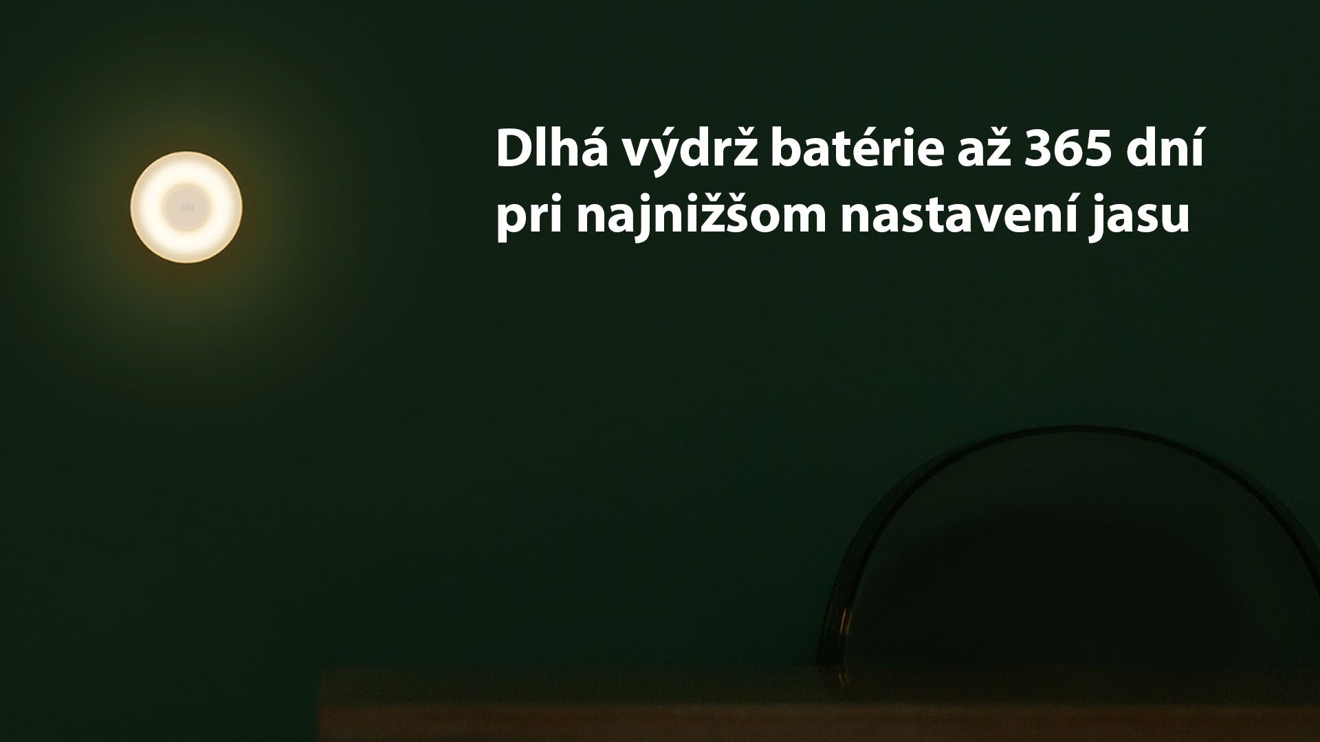 Výdrž batérie je 365 dní pri najnižšom nastavení jasu a 180 dní pri najvyššom nastavení jasu. Funkciu nočného svetla môžete vypnúť aj cez aplikáciu Mi Home/Xiaomi Home. Dlhodobé bezproblémové používanie so 17-mesačnou výdržou batérie pri čistom použití ako senzor.