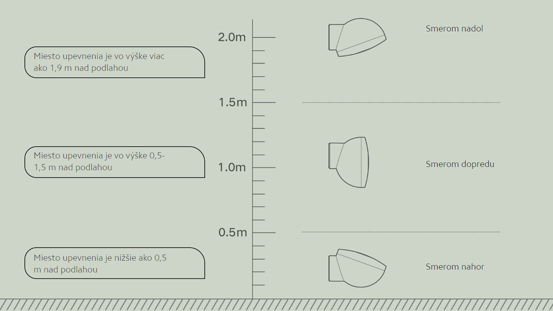 Pre presnú detekciu sa odporúča nasmerovať svetlo nadol, keď je základňa namontovaná vo výške viac ako 1,9 m nad podlahou. Z rovnakého dôvodu sa odporúča nasmerovať svetlo nahor, keď je základňa namontovaná pod 0,5 m nad podlahou. Pre rôzne výšky montáže je potrebné upraviť uhol na základe výšky užívateľa a požadovaného scenára použitia, aby sa dosiahol optimálny výsledok.
