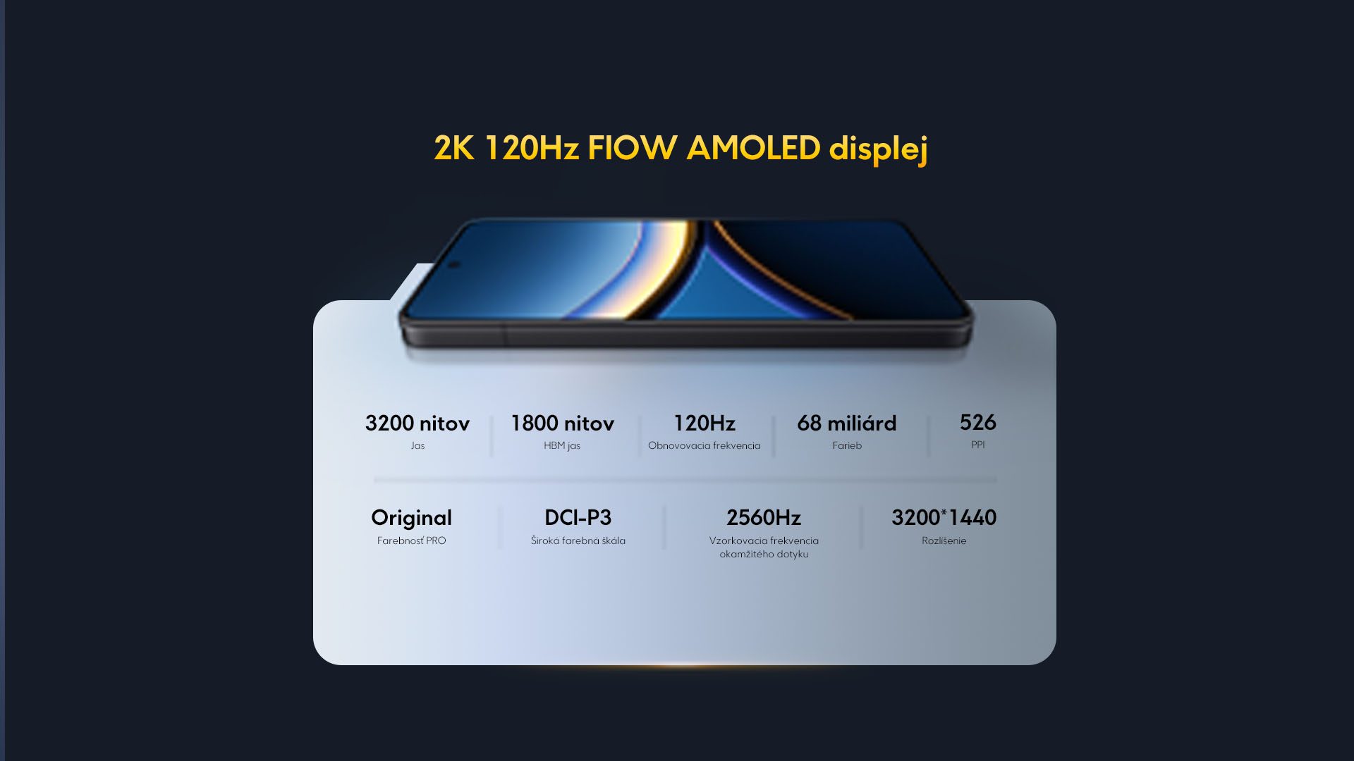 Veľká 6,67″ obrazovka s rozlíšením 2K (3200x1440p), maximálnym jasom 3200 nitov a vysokou 120Hz obnovovacou frekvenciou, ponúka množstvo vylepšených funkcií a prináša pohlcujúci vizuálny zážitok.