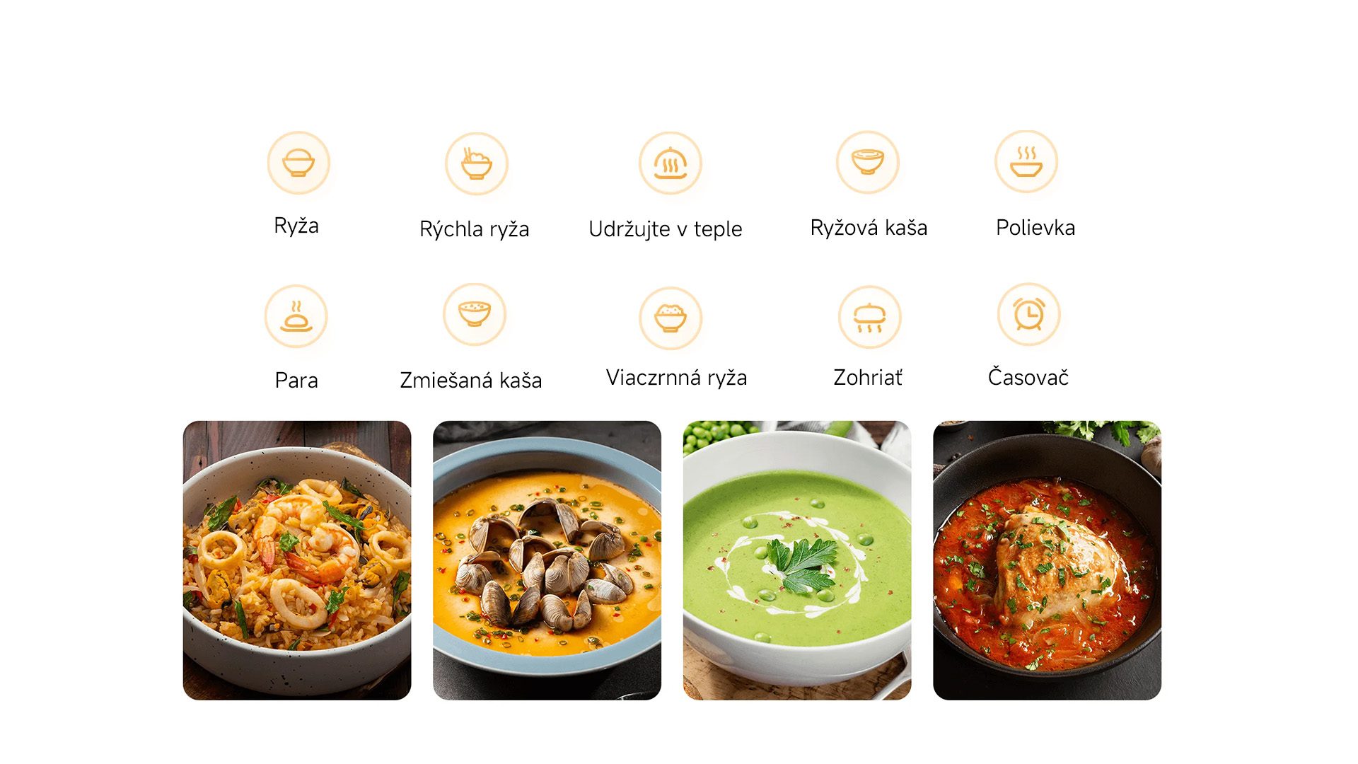 Nájdete tu desať základných funkcii varenia pre všetky základné potreby akými sú, varenie ryže, rýchle varenie ryže, udržiavanie teploty, congee, polievka, na pare, zmiešané congee, viaczrnná ryža, zohrievanie a časovač. Skrátka všetko pre jednoduchšie a pohodlnejšie varenie jediným dotykom.