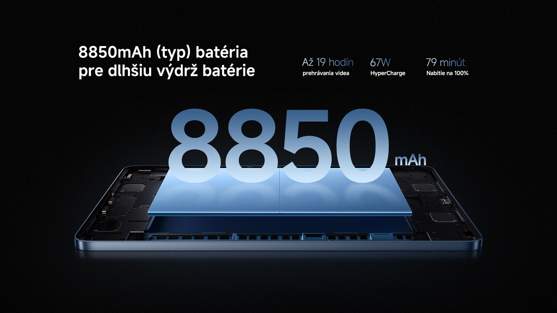 Xiaomi Pad 7 Pro je vybavený obrovskou batériou s kapacitou 8850 mAh (typ) a vďaka čipsetu Xiaomi Surge G1 pre správu batérie, ako aj optimalizácii systému Xiaomi HyperOS 2, dokáže zabezpečiť dlhotrvajúcu výdrž batérie. Vychutnáte si tak až 19 hodín prehrávania videa alebo až 262 hodín prehrávania hudby. A keď vám dôjde šťava, poteší vás výkonné 67W HyperCharge nabíjanie, ktoré vám tablet nabije už za 79 minút. *67W napájací adaptér nie je súčasťou balenia a predáva sa samostatne. Odporúčame používať originálny 67W napájací adaptér Xiaomi.
