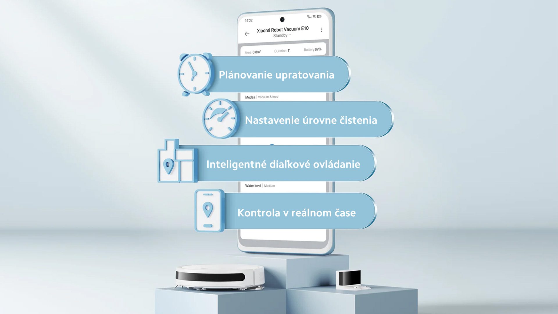 V aplikácii Xiaomi Home môžete diaľkovo ovládať upratovanie, kontrolovať stav upratovania v reálnom čase a plánovať čas spustenia upratovania. K dispozícii je taktiež podpora hlasového ovládania prostredníctvom Amazon Alexa alebo Google Assistant.