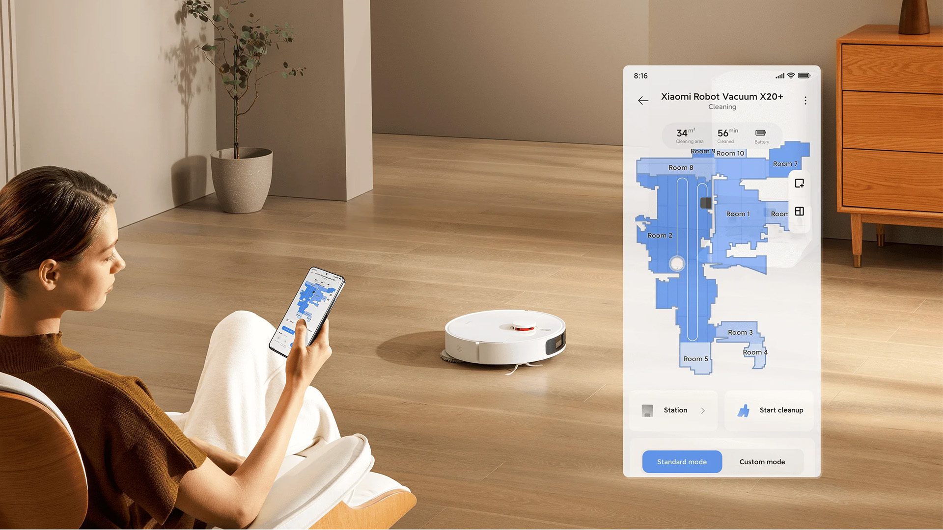 Ovládajte vysávač na diaľku a prispôsobte si upratovanie pomocou aplikácie Xiaomi Home/Mi Home. Aj keď sa práve nachádzate mimo domácnosť, jedným kliknutím v aplikácii, mu prikážete aby vyčistil podlahy v obývačke, spálni alebo kuchyni. K dispozícii máte štyri režimy čistenia: Vysávanie pred mopovaním, Vysávanie, Mopovanie, alebo kombinované Vysávanie a mopovanie.