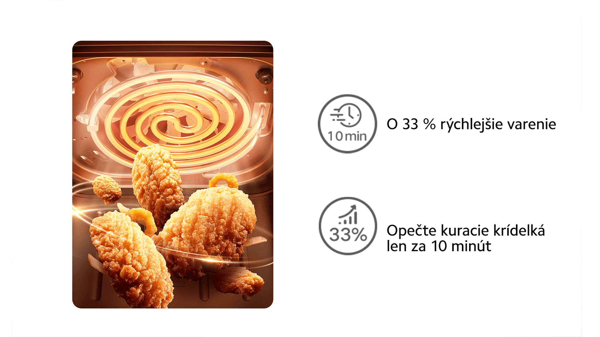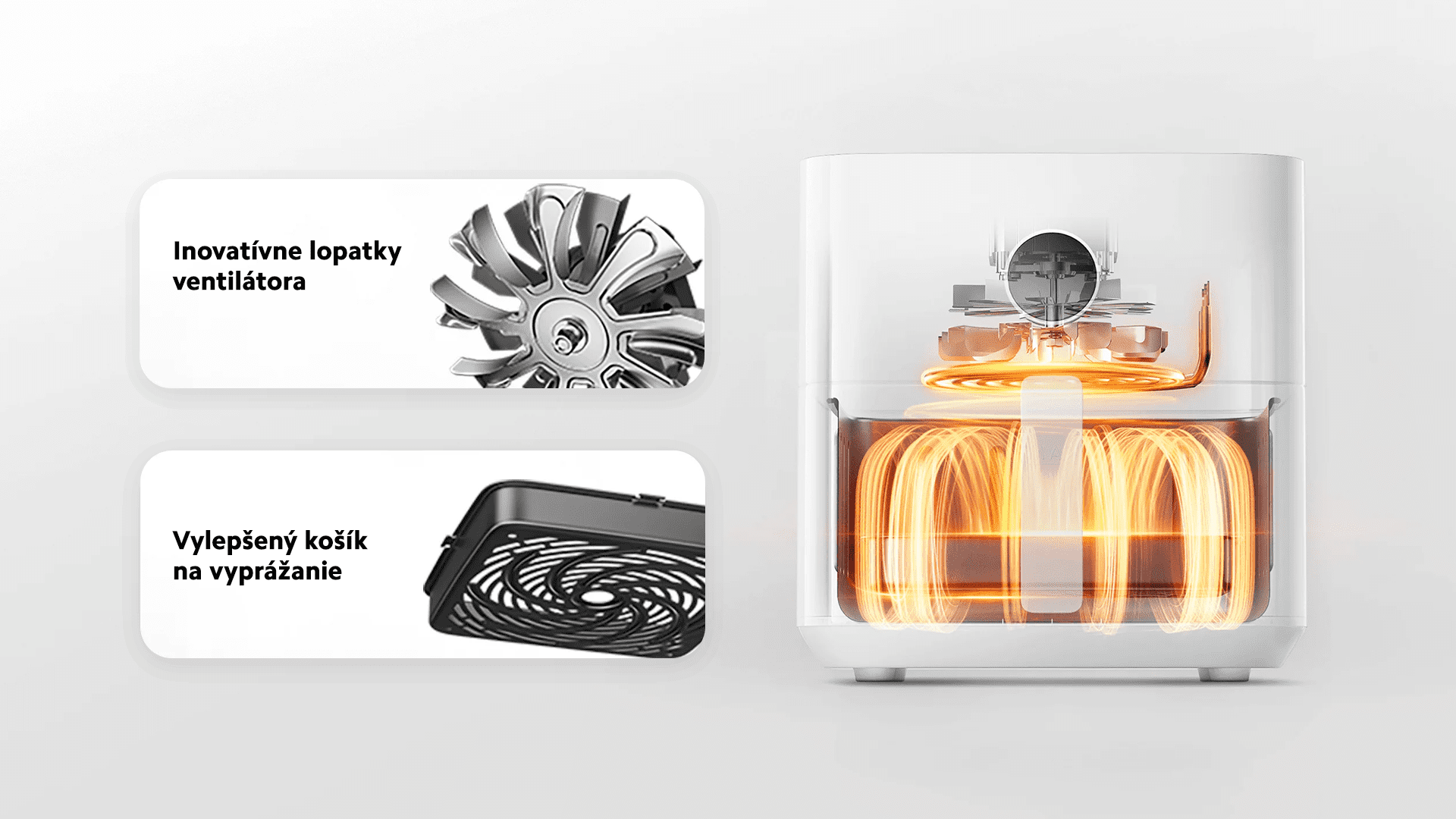 Vylepšená konštrukcia lopatiek ventilátora zlepšuje rozloženie a prúdenie horúceho vzduchu. Horúci vzduch smeruje priamo na dno fritovacieho koša, aby sa jedlo ohrialo rovnomerne a chrumkavo opražilo, bez potreby obracania.