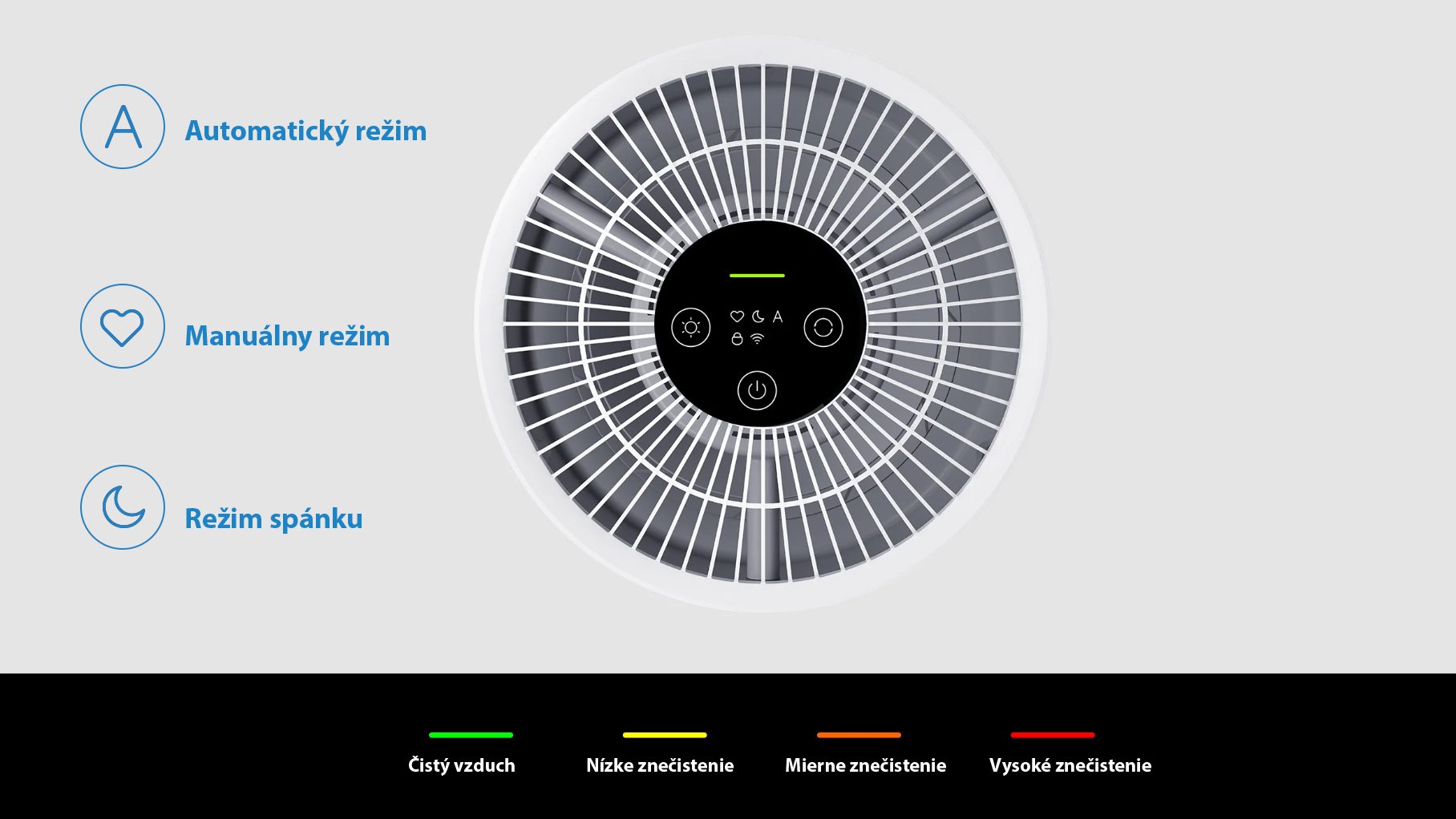 Zvoľte optimálnu rýchlosť zariadenia v jednom kroku. V manuálnom režime môžete nastaviť oblasť pokrytia a prispôsobiť rýchlosť podľa svojich preferencií. Údaje o kvalite vnútorného vzduchu sú zobrazené pomocu farebného indikátora, ktorý sa nachádza v hornej časti.