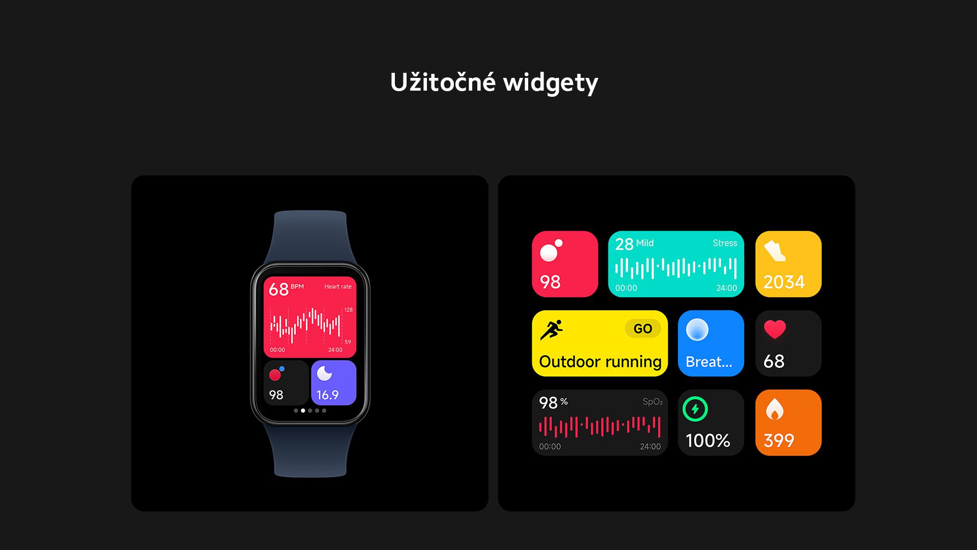 Vylepšené rozhranie a rozšírená ponuka widgetov vám dodá plnú kontrolu nad rozložení vašej obrazovky. Kombinujte praktické funkcie, ako je sledovanie fyzickej aktivity, monitorovanie zdravia, počasie, rozvrhy, platby a hudba, a prepínajte medzi nimi jednoducho v priebehu niekoľkých sekúnd.