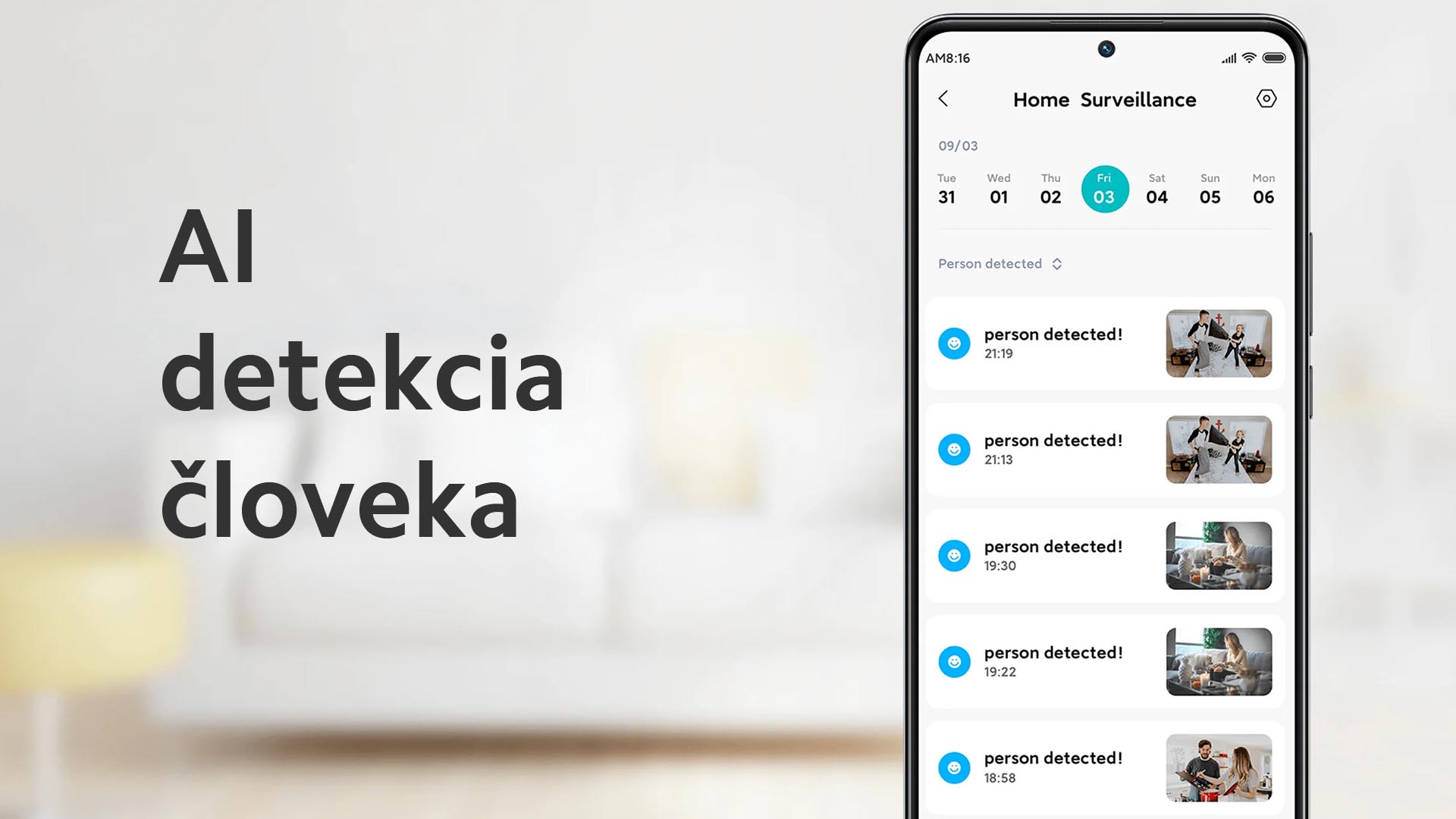 Úplne nový algoritmus detekcie človeka s umelou inteligenciou poskytuje rýchlejšiu detekciu obrysov. Kamera dokáže spustiť automatické nahrávanie po zachytení pohybu, pričom efektívne filtruje falošné poplachy.